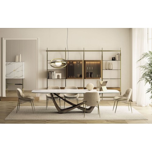Die Tischplatte ist in verschiedenen Ausführungen aus SuperKeramik, SuperMarmor, Kristall, furniertem Holz oder Art Glass erhältlich.
