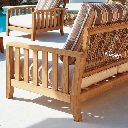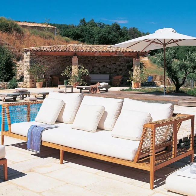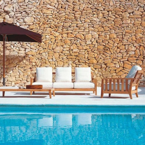 Das Gartensofa Synthesis von Unopiù verkörpert eine gelungene Balance zwischen modernem Design und natürlichen Materialien – ideal, um Außenbereiche mit Stil zu bereichern. Gefertigt aus hochwertigem Teakholz, das für seine Wetterbeständigkeit bekannt ist, wird es durch handgeflochtene Details aus synthetischer Faser veredelt, die dem Möbelstück eine kunsthandwerkliche und raffinierte Note verleihen. Ein elegantes, robustes und komfortables Möbelstück, perfekt, um das Leben im Freien zu jeder Jahreszeit zu genießen.