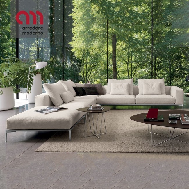 Canapé Savoye Désirée angulaire avec chaise longue de style élégant en forme de cockpit, où la légèreté et la sobriété des rembourrages informels se rencontrent harmonieusement. Il se caractérise par l'essentialité des lignes et de la structure surélevée par le sol qui améliore la beauté stylistique du canapé.