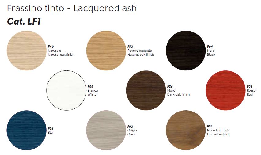 L'assise et le dossier sont en bois plaqué LI1 dans les finitions suivantes :