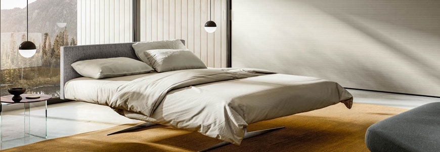 Lit Yale MDF Italia, Tête de lit capitonnée haute ou basse disponible. Pieds en aluminium peint. Sommier ou plateau orthopédique accessoirisable. Différentes tailles disponibles. -