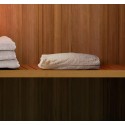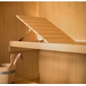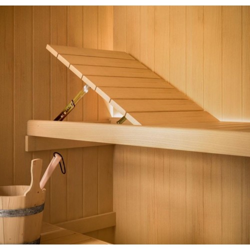 La sauna Hoshi è dotata di stufa con comandi integrati, pietre e cover in legno dogato, panca superiore con poggiatesta reclinabile integrato, panca inferiore, pedane a pavimento, clessidra, igrometro, termometro. Frontale in cristallo trasparente da 8 mm con porta battente, cerniere cromate, maniglia interna/esterna in legno. Tutti i lati esterni della sauna sono in finitura