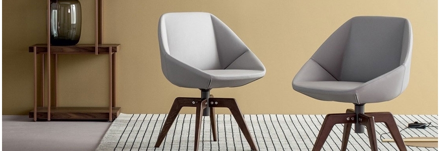Poltroncina Universal MDF Italia Girevole. Struttura girevole in metallo verniciato. Schienale in legno o rivestito. Seduta rivestita in tessuto o pelle. -